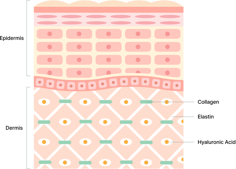 The extracellular matrix acts like soil within the dermis, providing the foundation where skin cells grow and function. It is composed of key elements such as collagen fibers, elastin, hyaluronic acid, and glycosaminoglycans (GAGs), supporting the skin’s hydration, elasticity, and regeneration.